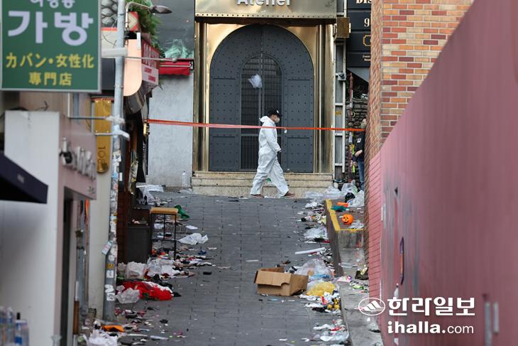 지난 29일 밤 서울 용산구 이태원 일대에서 대규모 압사사고가 발생한 가운데 30일 새벽 경찰들이 사고현장을 살펴보고 있다. 5 이태원 핼러윈의 악몽넘어진 사람 56겹 쌓였다종합2보 6 내 아들 찾아야 한다이태원 압사 현장 시신 수습도 힘든 상황.
